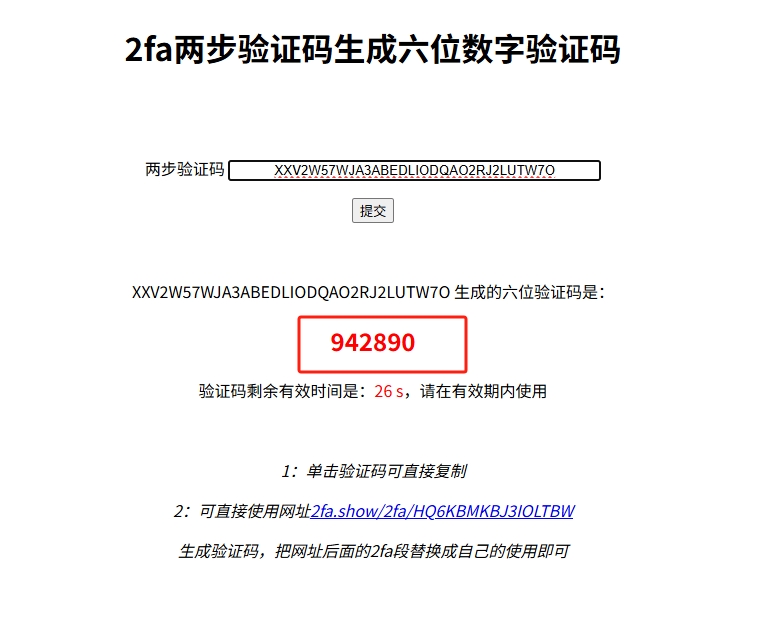 2FA的使用地址为 https://2fa.show 将两部密钥填入进去 即可获取6位验证码。